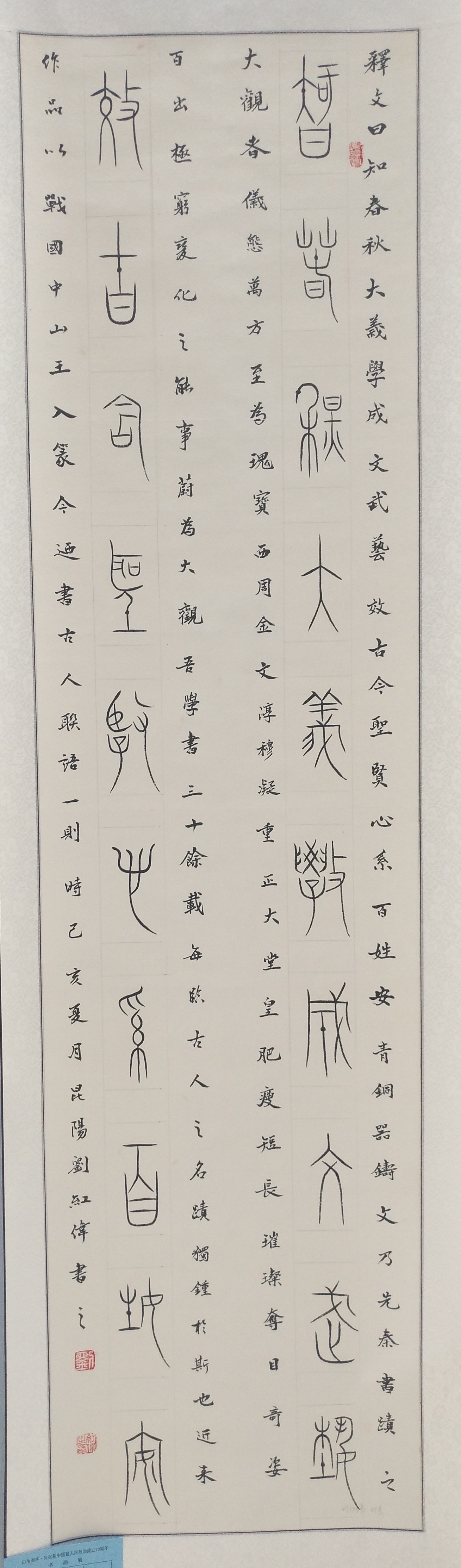 个人介绍:刘红伟,1969年4月生于叶县,2015年加入河南省书画学会,本科文化,幼承家训,喜书法,临池不辍。2016年参加中国书协首期“书法与文化”高级研修班学习,得到欧阳中石、周俊杰、李刚田,刘文华等老师亲授。主攻篆隶,兼涉行草,数十次参加全国各类书法大展赛。其中,2014年在河南省书法家协会主办的“郑州大观音寺”首届全国《心经》手卷书法大赛中获二等奖。著有书法作品集《诗风书韵》,获平顶山市首届文学艺术成果评选优秀奖。现为河南省书法家协会会员,首批中国文化和谐使者,加拿大中国文化研究院特约书法家。